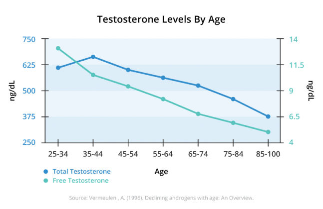 My research gleaned that testosterone levels in men start to spike during puberty and drop on average by one per cent every year after age 30. Do the math!