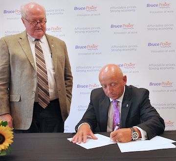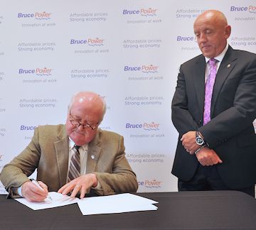 “A strong role for clean, affordable, reliable nuclear power will help sustain a highly-trained workforce and a robust, diversified economy, which is important to communities across Ontario and around the Bruce Power site in particular,” said Patrick Dillon, business manager and secretary-treasurer of the Provincial Building and Construction Trades Council of Ontario (in photo signing collaborative agreement, with Duncan Hawthorne, president and chief executive officer of Bruce Power).