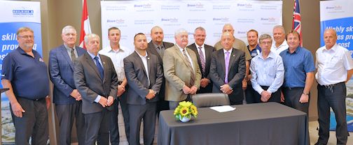 Ontario labour minister Kevin Flynn (C) joins the Provincial Building and Construction Trades Council of Ontario and Bruce Power in the signing of a collaborative agreement, Sept. 9; photos courtesy of Bruce Power