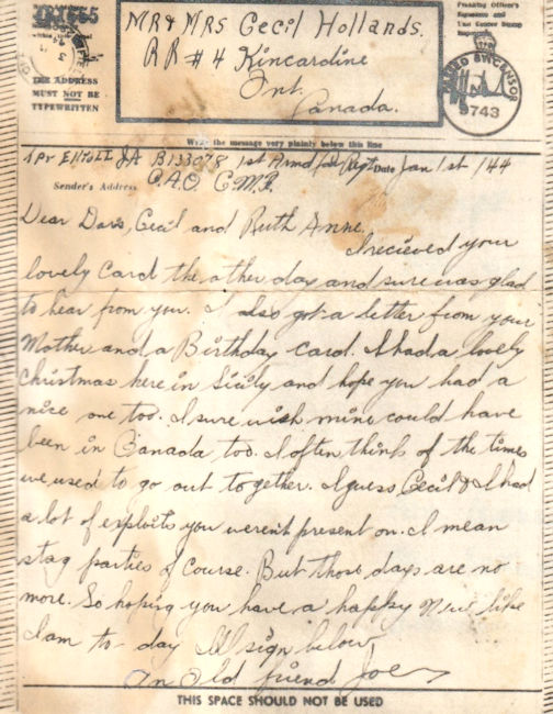 Joe’s service files tell us that he enlisted in Toronto in September, 1942 after working for some time for the General Steel Company there. He was sent to Dundurn, Saskatchewan, for training. There is a letter from him during that time but it eludes me at the moment.