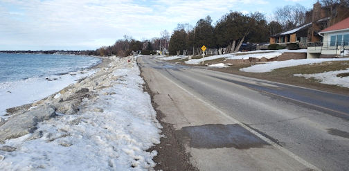 Just to the south, the Township of Huron-Kinloss has taken a very different tack. The beaches there are also eroding at an alarming rate. The grass ramp with the bench and boulder, south of Huronville Road, was a beautiful meeting place with railroad-tie steps and an easy slope down to the sand a mere two years ago. Today, it is a small patch of grass leading to a steep cliff of boulders.