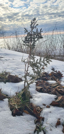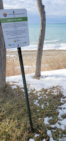 Huron-Kinloss planted a few tiny saplings (left) to stop erosion (pen used for perspective), but most died within a few days; volunteers planted many in the middle of the well-used picnic areas and trails and they were trampled by walkers and bikers; the rest were never maintained - no water or fertilizer - most of them dried up and died; a hearty few (like this 10-inch-tall cedar) remain. Centre photo shows another slightly larger sapling (13 inches tall); at right, a sign offers information about the project; photos by J. Rutledge