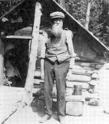 John the Hermit stands before his cabin, about 1917 (1982 BCHS Yearbook)
