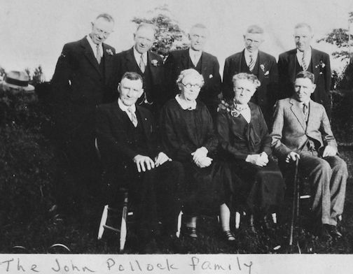 In this photo of the John Pollock Family, taken between 1925-34, are: standing, Alfred (left), Robert Andrew, Thomas, Charles Wesley, James D.; and seated, John (left), Mary Jane, Alice and William; photo courtesy of Ruth Anne Hollands Robinson