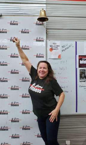 Kim Dixon rings the bell after achieving her first fitness goal in 2021