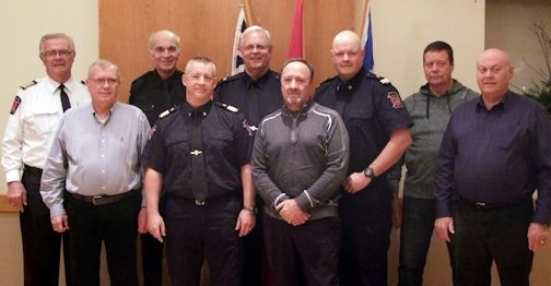 Ripley-Huron firefighters receiving awards, are, in back: Doug Martyn, Ed McGillivray, Ken Fischer, Scott Martyn, Brian Pollock; in front, are Joseph Hodgins (L), Jeff Pollard, John Ball, and Dan MacDonald; absent is Murray Yungblut; photo courtesy of Huron-Kinloss Township