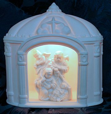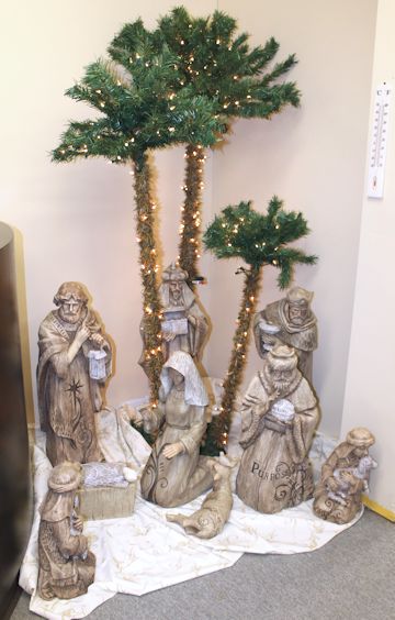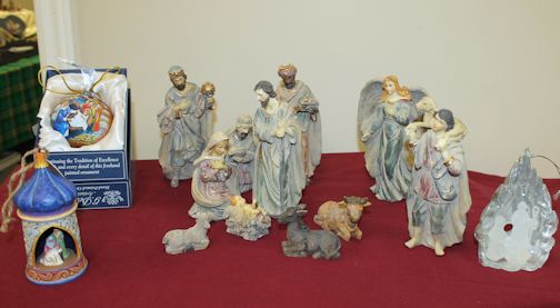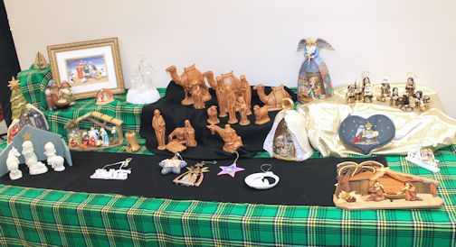 Among the many beautiful nativities, are a felt set made by Mary Beth Dennis, and a large set owned by Betty Elliott.