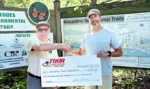 Shane Hotchkiss (right) of the Tour of Kincardine Bike Race presents a cheque for $2,100 to Dave Lafortune, chairman of the Kincardine Trails Association; the proceeds are from the 2024 event, and will be used to help upgrade and extend Kincardine’s trail system; photo courtesy of Dave Lafortune