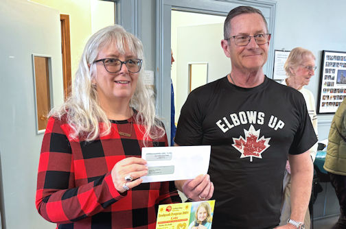 While they were appreciating the delicious food and each other's company, Rev. Dan West of Knox Kincardine, presented a donation of $2,500 to Francesca Dobbyn, executive director of the United Way of Bruce Grey, for the 2025 backpack program.