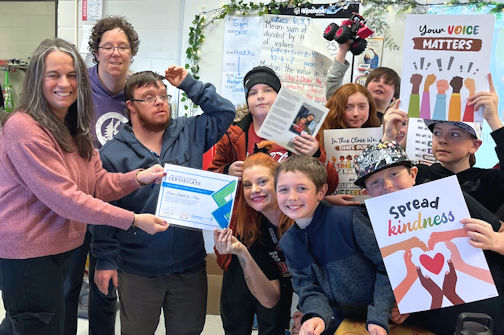 Community Living of Kincardine and District staff member Julie Sharpe (left) and supported individuals Marianne Stewart and John McCourt present an Inclusive Education Certificate to Huron Heights Grade 5 teacher, Kirsten Ryan and her students, recognizing the many classroom practices that contribute to this inclusive learning environment