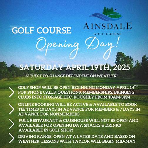 The warm, sunny weather is upon us, and with that, Ainsdale Golf Course, located just off Highway 21, south of Kincardine, is set to open Saturday, April 19, at 9:04 a.m.