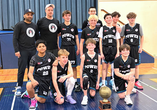 The Kincardine Power U15 team includes, in back, coach Usman Bhatti (left),Travis Crawford, Brayden Campbell, Edwin Crawford, Colton Bernard, Easton Abbott, Tyson Foerster, Keagan Hill; and in front, Zain Bhatti (left), Sam Edward, Grant Crawford and Hudson Ruthven; photo by Stacy Bamford