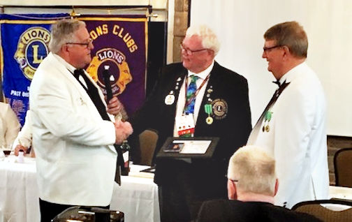 Ripley Lion Larry Irwin (centre) receives the District Governor Appreciation pin and certificate from District A9 Governor Tim Meyers (left) and International Director Bert Nelson of New York Mills, Minnesota, at the District Convention in Orangeville on the weekend; photos by Charles Liddle