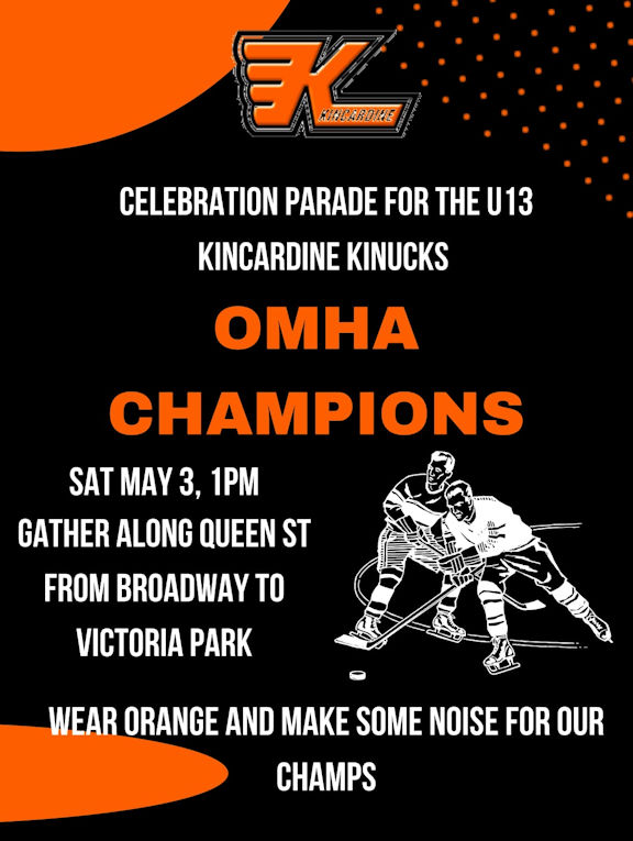 The Kincardine Legion U13 Kinucks are celebrating their OMHA Championship with a parade through downtown Kincardine, this Saturday, May 3, beginning at 1 p.m.