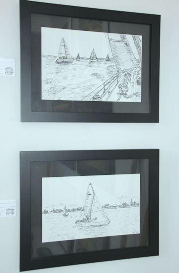 “The Art of Water and Reflection” features a “boating” theme, with mostly watercolour-and-ink paintings of sailboats on the water. She also has some pen-and-ink pieces, artisan-painted paddles, crafted sailboat sail bags, and driftwood art.