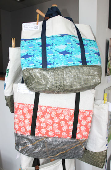 One of Chan’s most innovative projects involves upcycled tote bags crafted from sailboat sails. Practical and stylish, these bags are perfect for beach outings and cottage life. By re-purposing materials associated with her time on the water, she creates objects that carry both a personal story and a broader message about environmental consciousness.