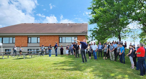 Erik Downing (centre, pointing), general manager/secretary-treasurer of the SVCA, addresses the crowd at the 75th anniversary celebration, prior to the group going for a walk at the newly-opened conservation area; photos by the SVCA