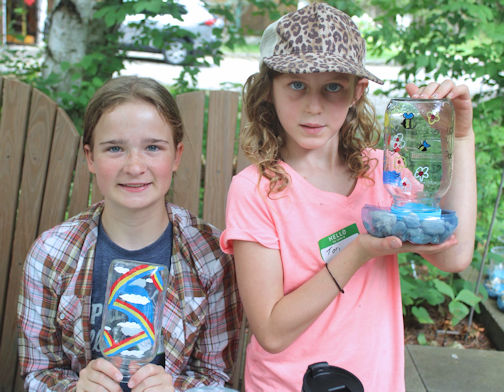 While the scavenger hunt was taking place, the second group learned how to make insect watering stations, using mason jars, small pebbles and plastic lids. The jars are filled with water, which then trickles out of small holes in the lid to soak the pebbles, providing insects with a place to land while they drink. The kids had a lot of fun decorating their jars with paint pens, and coming up with pollinator-related designs. The leaders are always so pleased with the way the kids encourage one another and share materials during craft time.