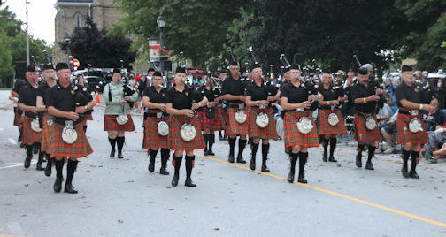 Following the afternoon of entertainment, the visiting bands formed up along Durham Market North, beside Victoria Park, to join the Kincardine Scottish Pipe Band in the traditional Saturday Night Parade through downtown Kincardine. There were about 170 pipers and drummers taking part in the massed band parade.
