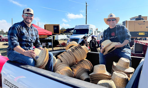 Bruce Power's Pat Dalzell (left) and Clint Thomas hand out hats during the opening parade at the 2025 International Plowing Match and Rural Expo