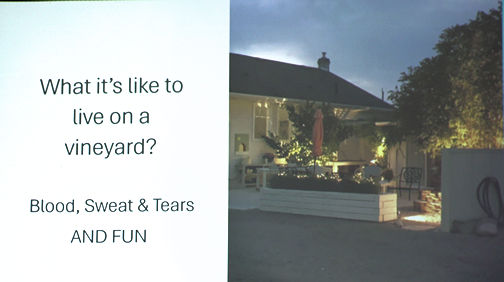 Miszturak organized her presentation seasonally and described in detail the tasks particular to each, from pruning in spring through to harvest in the fall, wine-making and winter preparations. Photos and graphics accompanied her wry, and often amusing, accounts.