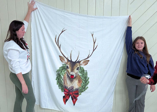 Volunteers Emma Beitz (left) and Leah Andruski put this Christmas shower curtain on display