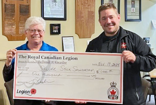 Kincardine Legion sports chairperson Cathy Alcombrack (left) presents a $1,000 donation to Jeremy McQuillin of the Kincardine Silver Stick Tournament
