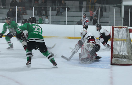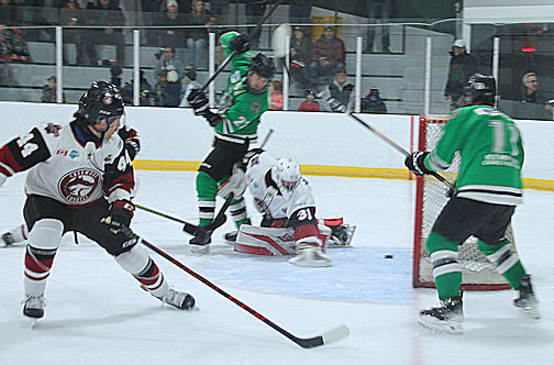 Gerrit Satosek (centre) and Dan Nicoloff (right) of the Ripley Wolves watch as the puck goes into the net past the scrambling Creemore goalie, in the game Sunday afternoon, Nov. 16, at the Ripley Arena; photos by David Dadson