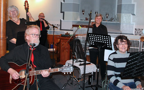 Band members Karen Weber (left), Steve Deer, Brian Tovey, Diane Wall and Hilary McPherson accompany the Kincardine Community Singers during dress rehearsal; photos by David Dadson