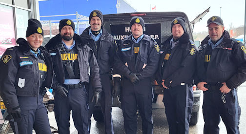 Huron County OPP auxiliary officers Shalen Kernighan (left), Maksym Shevchuk, Ryan Kikkert, Patrick O'Donnell, Mike Bentley and Wayne McConnell collect donations at the food drive in Goderich, Saturday
