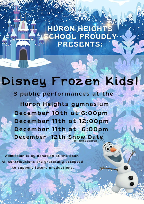 “Frozen” is open to the public for three performances: Dec. 10 at 6 p.m., and Dec. 11 at Noon and 6 p.m. in the school gymnasium. Dec. 12 has been reserved as a snow date, if necessary. Admission is by donation at the door. All proceeds go to support future productions.