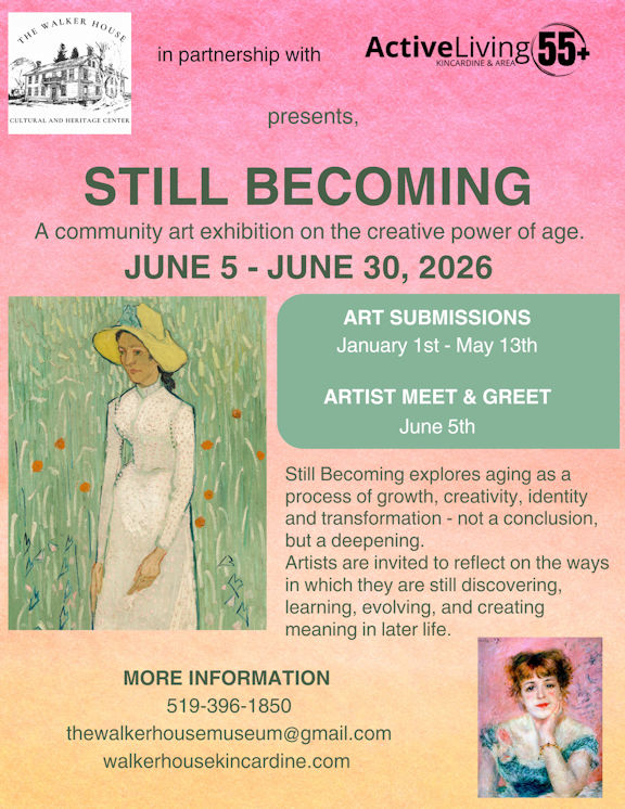 Artists are invited to submit their work, beginning Jan. 1, 2026, for "Still Becoming: A Community Art Exhibition on the Creative Power of Age," hosted by the Walker House Museum in Kincardine.