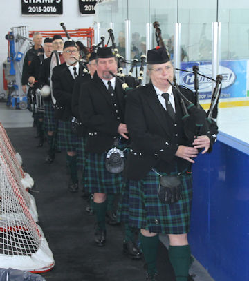 The opening ceremonies began with members of the Kincardine Scottish Pipe Band leading the dignitaries to the ice surface, and Ruby Wreford singing “O Canada.”