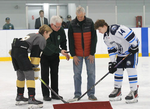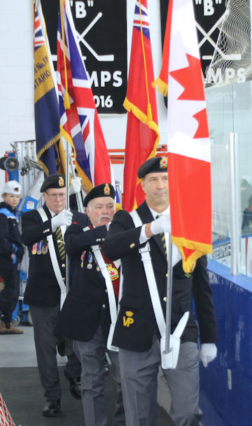 Liddle and Van Gaver dropped the ceremonial puck at the opening of the tournament. Joining them, were Teri Leslie, president of the Kincardine Legion, official sponsor of the Under-13 (U13) B Tier 2 division, first-vice Cathy Alcombrack, and the Colour Party: Shane Hotchkiss, Dave Dechene and Mike Dupuis, with sergeant-at-arms Kirk Rutledge.