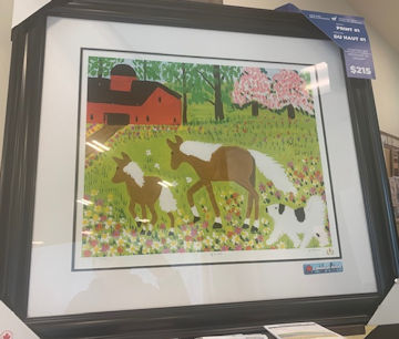Meanwhile, the first picture at Sobeys Kincardine is entitled, "Horses," by Nova Scotian artist Maud Lewis. This lovely outdoor scene shows a couple of horses being brought back to the barn by a dog. Lewis used bright colours in her paintings and often included flowers and animals.
