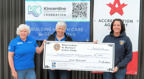 Members of the Kincardine and District Lions Club were at the South Bruce Grey Health Centre, Kincardine, Thursday, to present a donation of $7,000 to the Kincardine and Community Health Care Foundation.