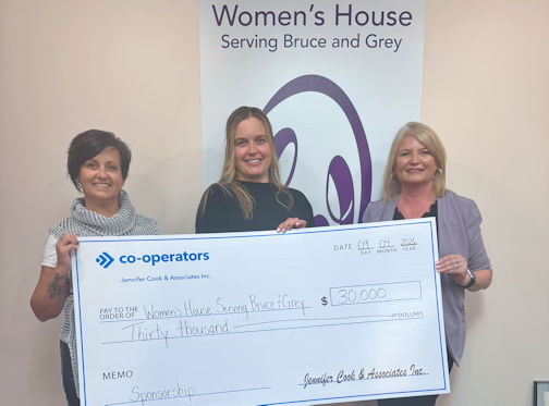 Jennifer Cook (left) of The Co-operators in Kincardine and Stacey Catalano of The Co-operators in Port Elgin present a donation of $30,000 to Danielle Bois, community relations and fund development co-ordinator at the Women's House Serving Bruce and Grey; photo courtesy of Jennifer Cook