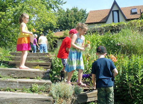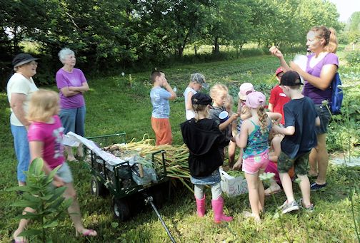 Leader Heather Newman (R) shows members of the Ripley Horticultural Society's youth club her vegetable garden; photos by Tryntje Eisen