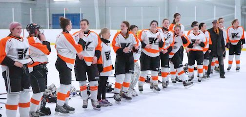 The third round-robin game was against the Mooretown Flag Ladies, a team that had beat the Kinucks earlier this season. This was an action-packed match, with the Kinucks taking a 3-1 lead in the first period, scoring another goal in the second, and both teams scoring in the third, to take the 5-2 win.