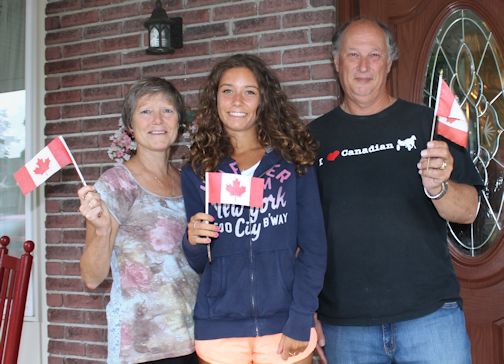 Caroline Balbo (C) of Vicenza, Italy, waves Canadian flags with her Kincardine hosts, Linda (L) and Ken Stanley