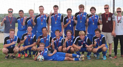 The Kincardine Tim-Br Mart Under-19 boys soccer team includes, back, coach Derek Andrew (L), Alex Pande, Kalvin Stares, Marcello Pagnotta, Peter DeJong, Ethan Long, Jayson MacKinnon, Stephen Ritter, and coaches Andreas Derksen and Andrew Benney; front, Grant Stevens (L), Derrick Bernath, J.P. Catelo, Brett Colhoun, Gavin Reardon, Corey Howse, and Austin Nickel; in the very front, lying down, is Jesse Lynch; absent, are Rachit Sood, Nikhil Deshpande, Rahul Deshpande, Kyle Andrew, and Marcel Inauen; photo by Mary Ritter