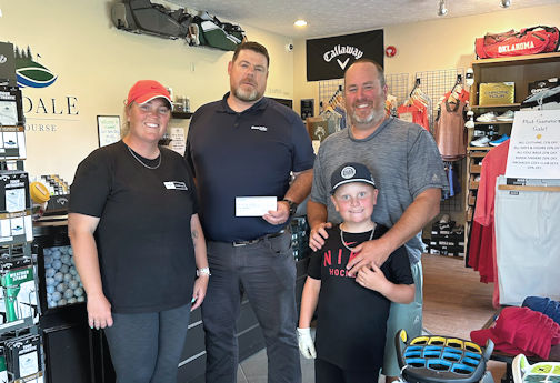 Taylor (left), and Charles Candler (right) and their son, Wyatt (in front), present a donation to Joe Scott of Huron-Bruce Minor Hockey; photo courtesy of Ainsdale Golf Course