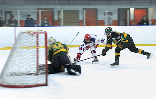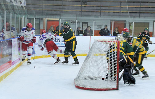 Trent Houghton (centre) of the ‘Dogs tries to poke the puck past the Mount Forest goalie