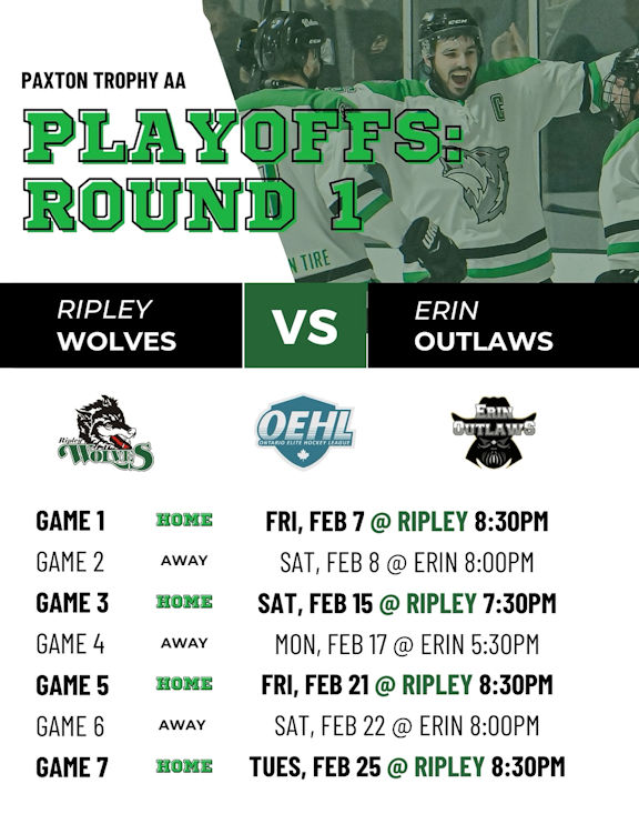 Game 2 will be in Erin, Saturday, Feb. 8, with time TBD. Game 3 will be at home, Saturday, Feb. 15, at 7:30 p.m., as part of the annual Ripley Winter Carnival.
