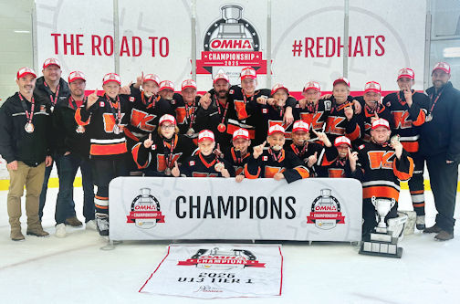 The Kincardine Legion U13 Kinucks win the OMHA championship; in the back, are assistant coach Kent Liddle (left), trainer Brock Lowry, manager Evan Cohoon, Easton Lowry, Blake McCrae, Mason Caravaggio, Andrew Humphrey, head coach Brent Walton, Ronin MacIntosh, Carson Tout, Braedy Collins, Will Murphy, Evan McGillivary, Nash Liddle, and trainer Wes Dietrich; and in the front, are AP goalie Caleb Gurr (left), Lawson Cohoon, Colby Walton, Max Malhotra, Ryder Dietrich, Spencer McKenzie, and Lincoln Coutts; photo by Becky Cohoon