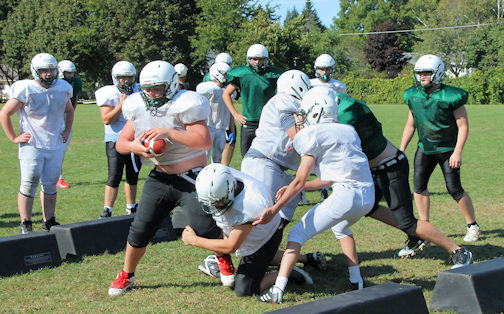 The football team has about 40 players in Grades 9-12, and 11 coaches. They practise on the field across from KDSS, Monday to Thursday, 3:30-5 p.m.