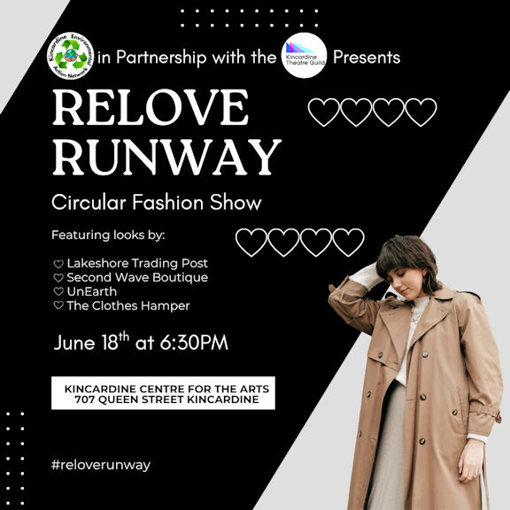 Also, in partnership with the Kincardine Theatre Guild, KEAN is hosting a circular fashion show, "Relove Runway," Thursday, June 18, beginning at 6:30 p.m., at the Kincardine Arts Centre in downtown Kincardine.
