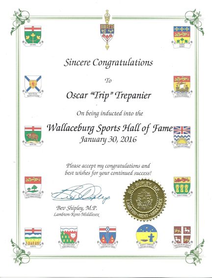 Oscar "Trip" Trepanier of Kincardine has been inducted into the Wallaceburg Sports Hall of Fame - one of several names listed on the Frank and Zine Mann Honour Roll, as a Master Classic Inductee.