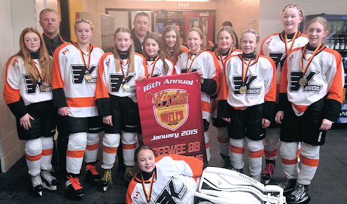 The Kincardine Sobeys Peewee girls rep. team wins the "BB" banner and gold medals at the 2015 GGHA 16th Annual Hockey Tournament; photo courtesy of the Kincardine Sobeys Peewee girls team