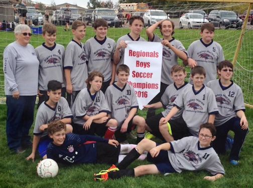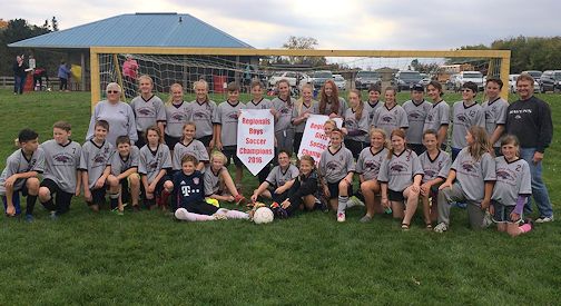 The Ripley Ravens boys soccer team includes, in back, coach Barb Grubb (left), Dean White, Gavin Feldman, Kyle Smeltzer, Matthew Derkack, Paiten Priboj, Nolan Neitzel; in front, Tainnen Stone (left), Owen Bacon, Zack Stoneman, AJ Hill, Seth Harper, Andrew Gibson; and lying down in front, Cole Snobelen (left) and Conor Greenwood; absent, is Ty Pollard; photos courtesy of Barb Grubb